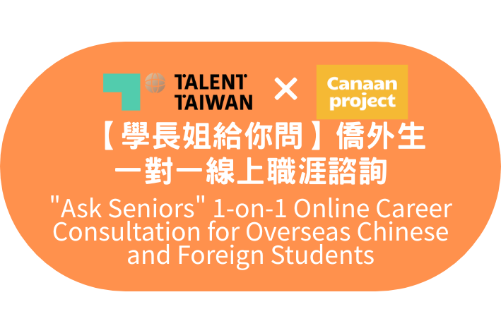 Talent Taiwan 攜手 Canaan Project 推出【學長姐給你問】僑外生專屬一對一線上職涯諮詢服務,邀請 6 位來自不同產業背景、在台工作的學長姐擔任 Mentor,免費提供經驗分享與職涯指引,協助你了解留台就業的實務面。諮詢內容包含 Talent Taiwan has partnered with the Canaan Project to launch the "Ask Seniors" program—an exclusive 1-on-1 online career consultation service for overseas Chinese and foreign students. We have invited 6 mentors from various industrial backgrounds working in Taiwan to share their experiences and provide career guidance for free, helping you understand the practical aspects of working in Taiwan. Consultation topics include: