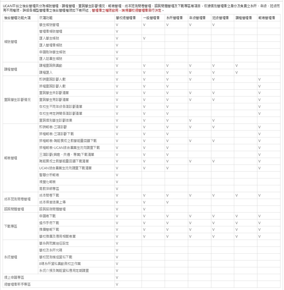⚠️下表為UCAN後台各類管理功能帳號類別,提供老師參考,如有需要其他功能,敬請與本中心聯繫082-313741。