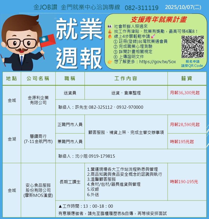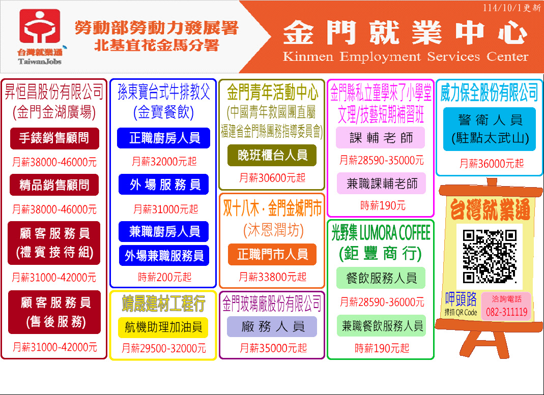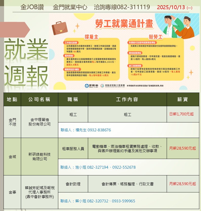 📌【金門就業中心】2025年10月金門地區急徵人才資訊&就業週報(持續更新)