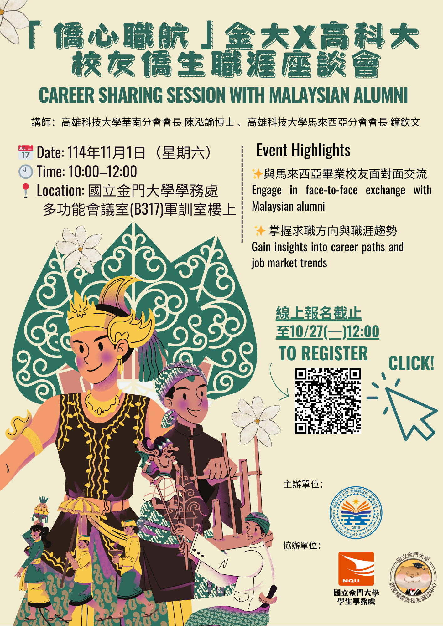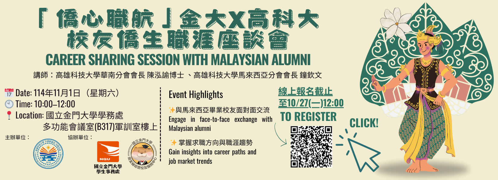 📌【線上報名至10/27中午12點】11月1日(六)上午10:00「僑心職航」金大×高科大 校友僑生職涯座談會,歡迎本校僑外生、對馬來西亞&東南亞國家就業有興趣者報名參加!