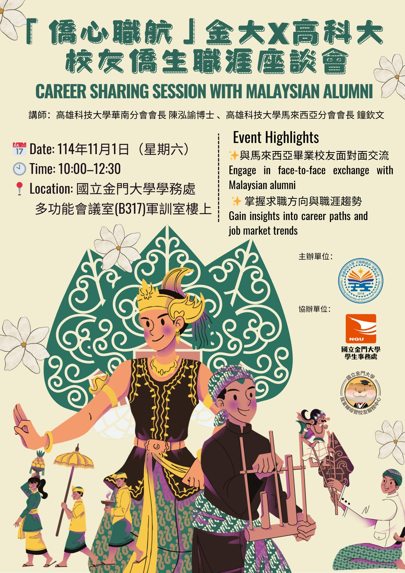 (報名已截止)11月1日(六)上午10:00「僑心職航」金大×高科大 校友僑生職涯座談會,歡迎本校僑外生、對馬來西亞&東南亞國家就業有興趣者報名參加!
