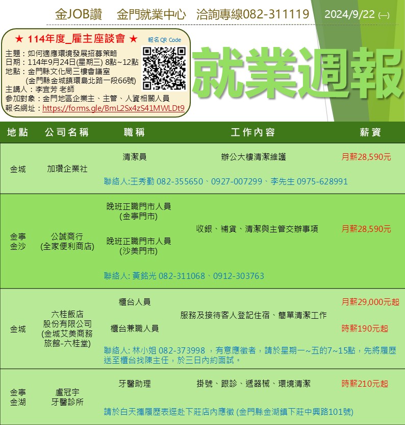 【Kinmen Employment Center】Urgent Job Openings in Kinmen Area for September 2025 & Employment Weekly Bulletin (Continuously Updated)