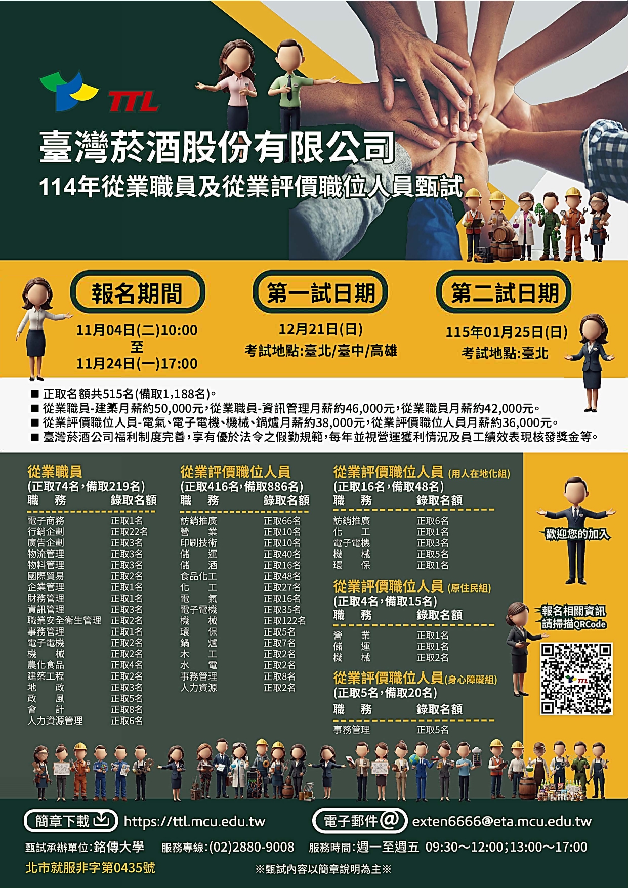 【銘傳大學】本校辦理臺灣菸酒股份有限公司114年從業職員及從業評價職位人員甄試簡章,歡迎畢業生、校友、求職需求者踴躍報考!