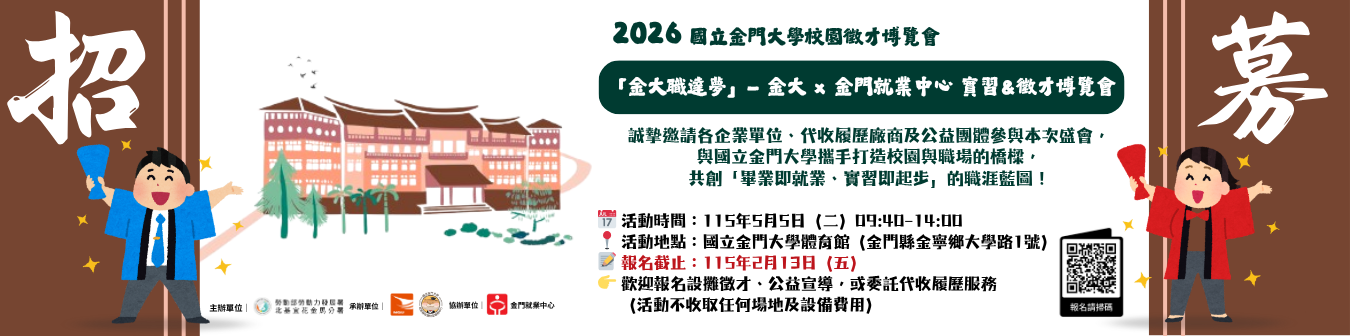 📌【開放報名中!】金大職達夢-2026金大 x 金門就業中心 實習&徵才博覽會,歡迎徵才廠商、公益團體踴躍報名參加!(自即日起至2026/2/13止)