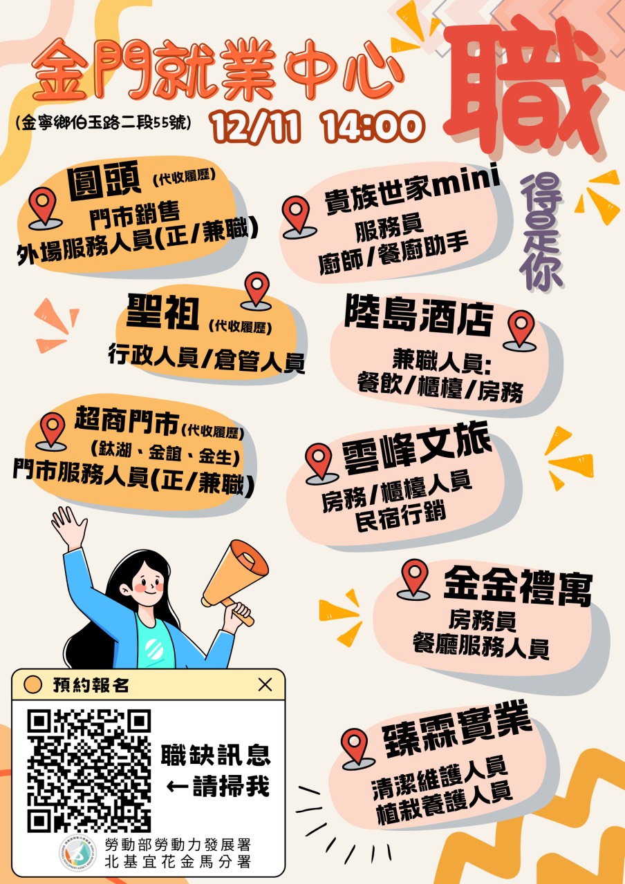【金門就業中心】12/11(四)14:00-16:00⭐職得是你⭐今年度最後一場聯合徵才活動!想找工作或準備轉職的朋友們,千萬別錯過!記得先線上/電話/臨櫃預約活動當日面試時間唷!
