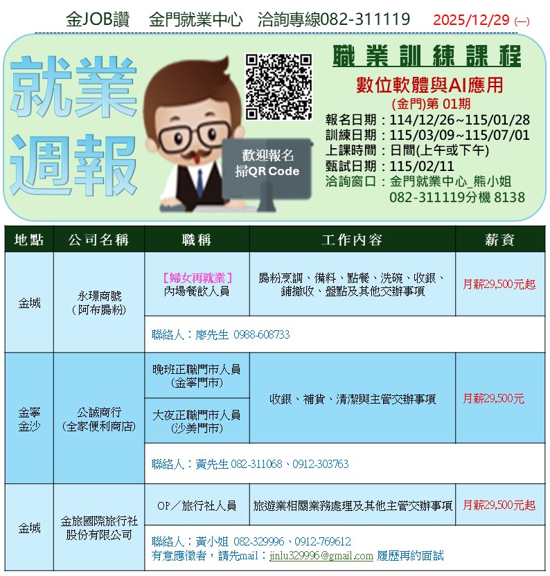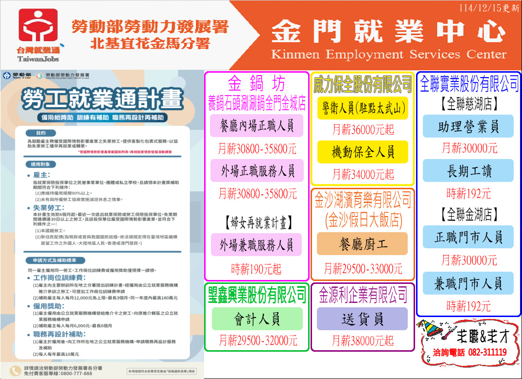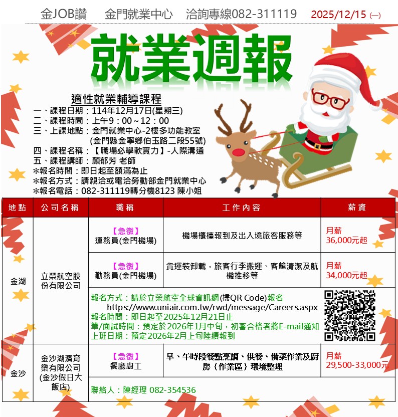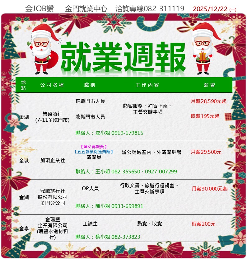 【金門就業中心】2025年12月金門地區急徵人才資訊&就業週報(持續更新)