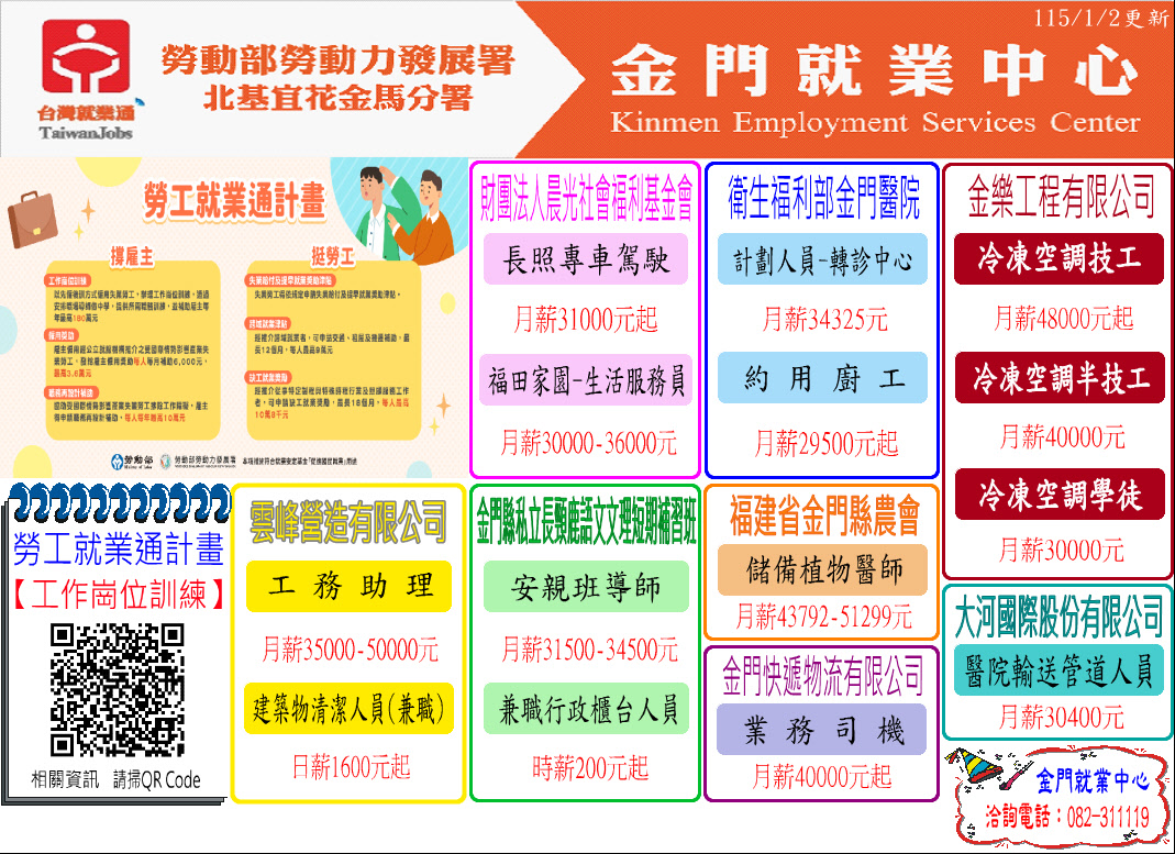 📌【金門就業中心】2026年1月金門地區急徵人才資訊&就業週報(持續更新)