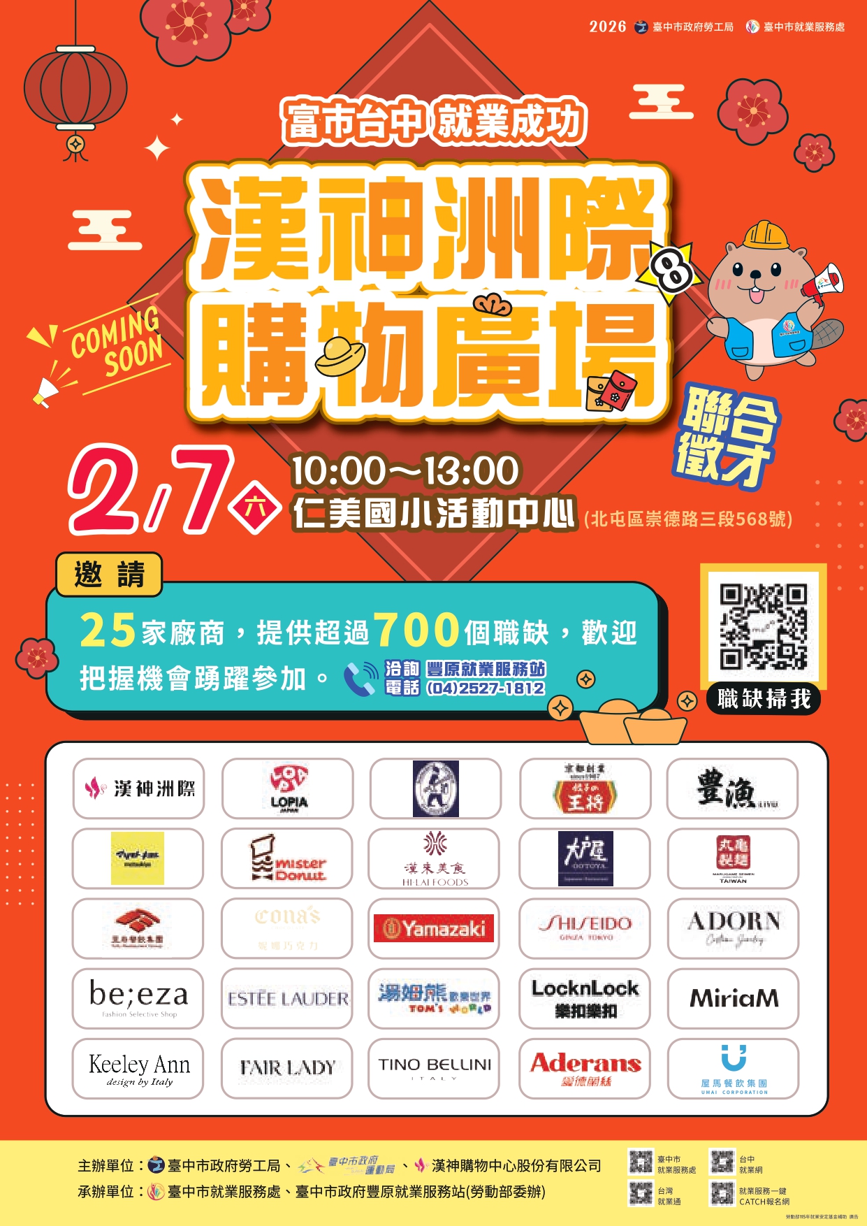【臺中市政府勞工局】本市就業服務處訂於115年2月7日(星期六)假仁美國民小學活動中心辦理「富市台中 就業成功」漢神洲際購物廣場聯合徵才,歡迎踴躍參加。