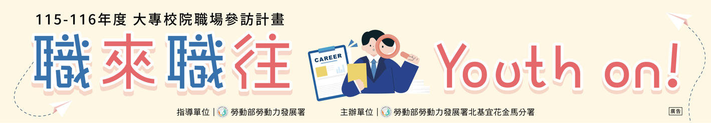 📌勞動部北分署「115年度上半年大專校院職場參訪」,校內受理期間至115/2/25(三)中午12點止,如欲申請者請留意校內受理期間。