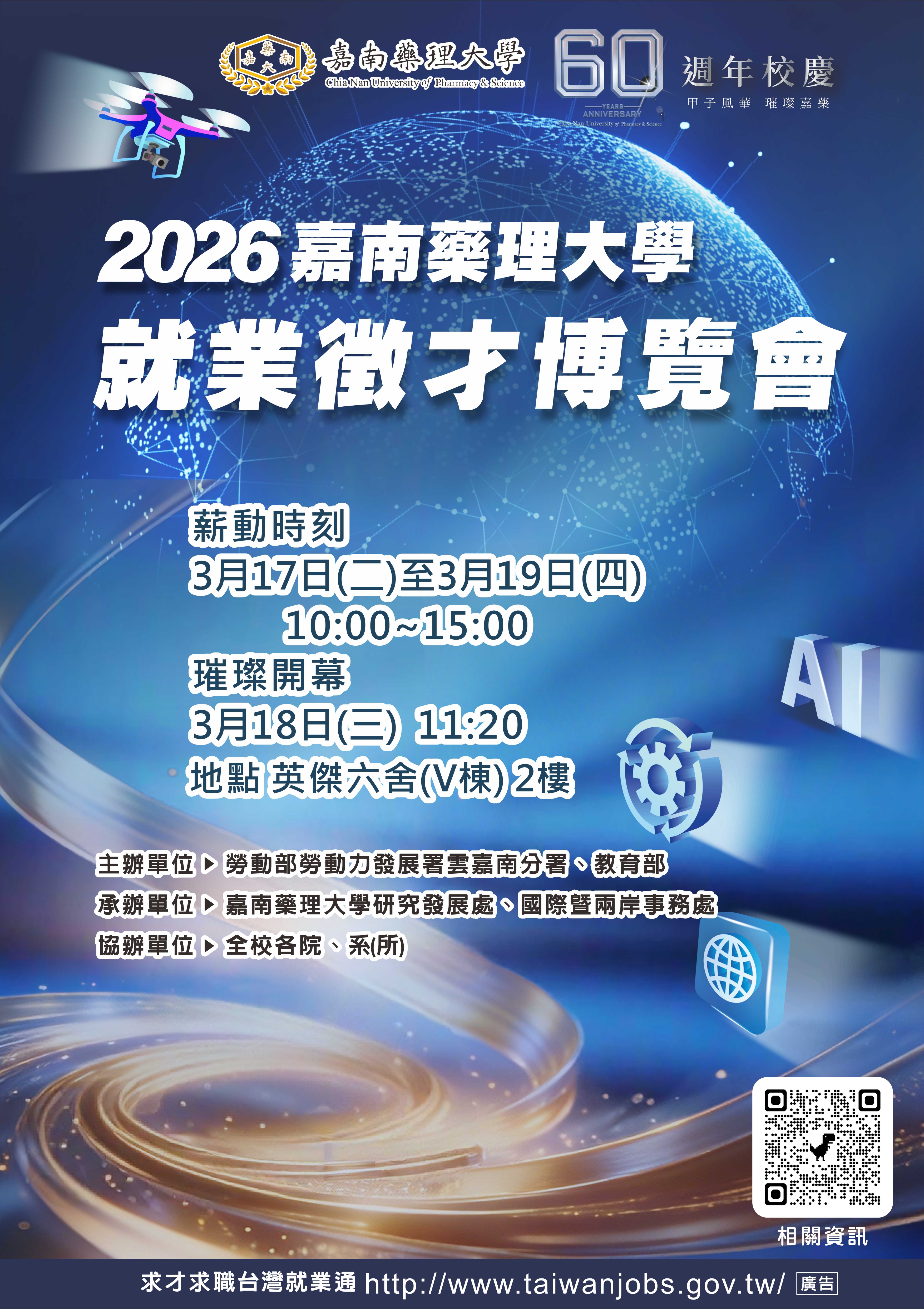 本校辦理「甲子風華 璀璨嘉藥」60週年校慶系列活動之就業徵才博覽會,行程如說明,請查照並蒞臨指教。