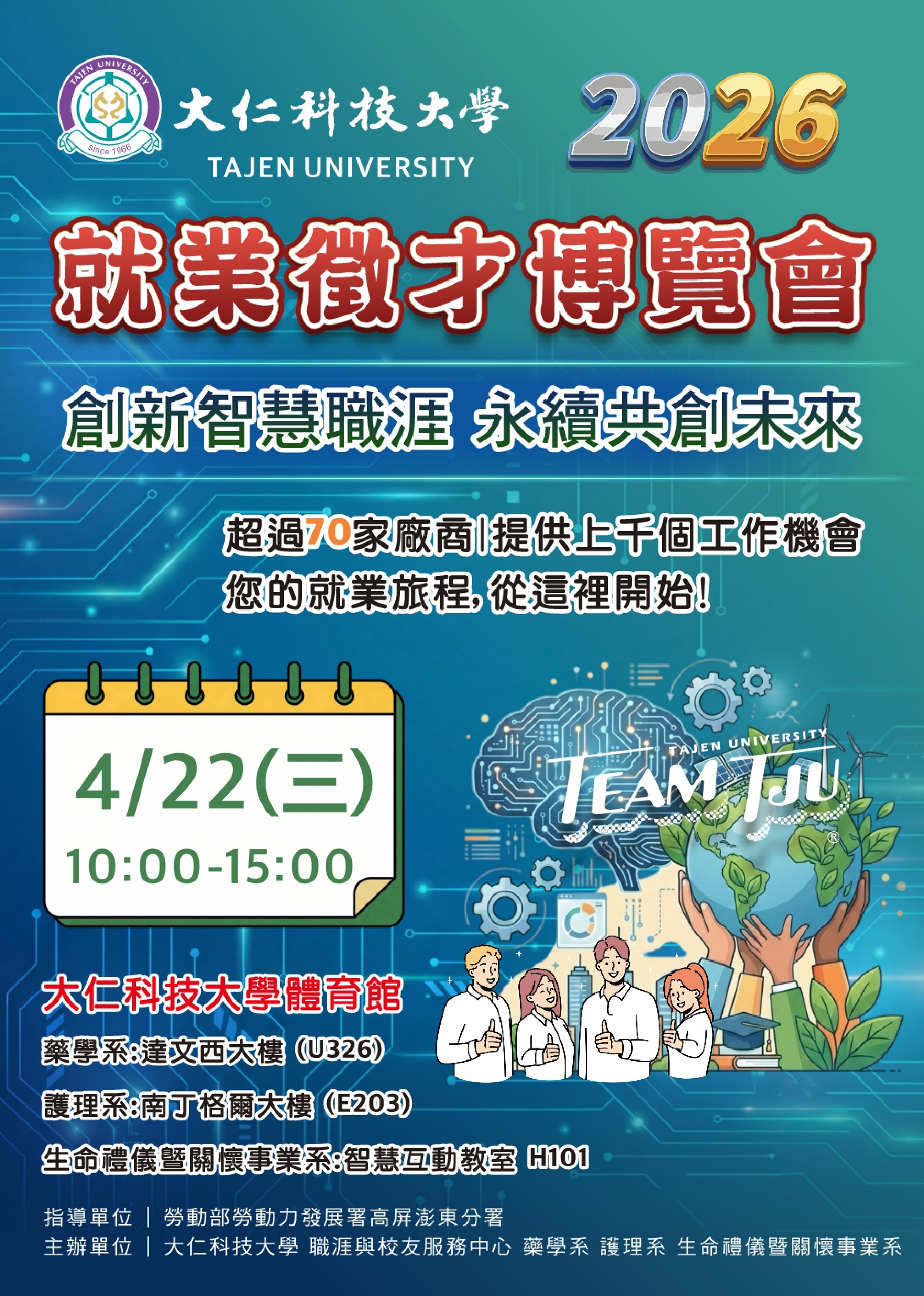 本校謹訂於115年4月22日(星期三)舉辦2026大仁「創新智慧職涯,永續共創未來」校園徵才就業博覽會活動,敬請貴校協助宣傳並鼓勵學生踴躍參加,請查照。