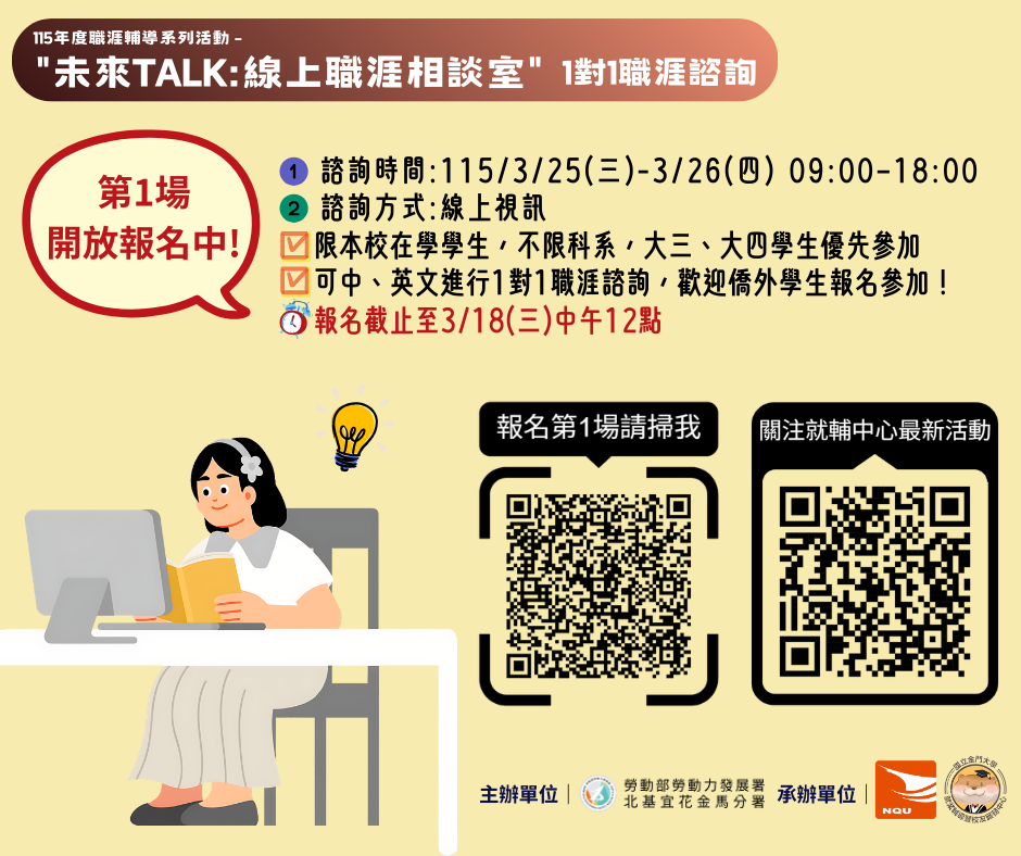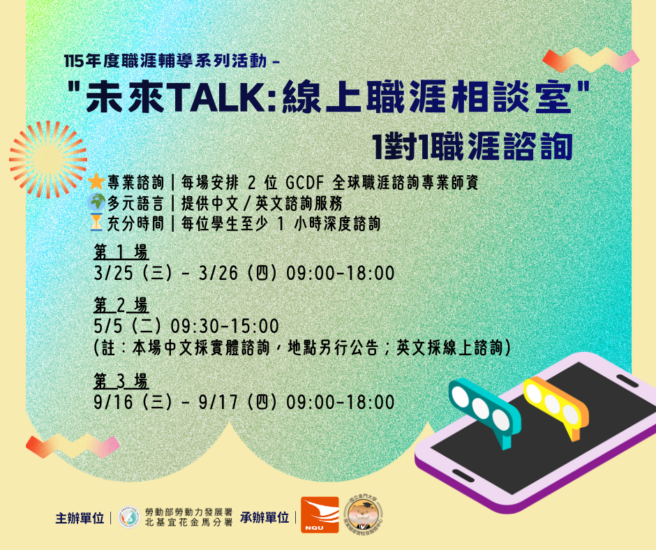 📌【開放報名中】「未來TALK:線上職涯相談室」1對1職涯諮詢(第1場)3/25–26|線上免費報名至3/18(三)12:00止