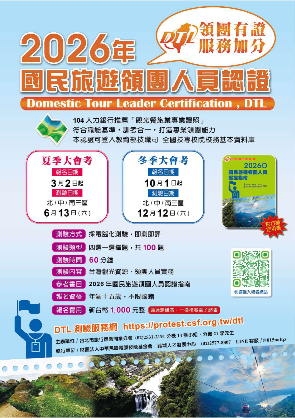 四、 認證項目: 觀光類:DTL 國民旅遊領團人員認證、OPC 旅遊產品操作人員認證、PTD 旅遊行程設計師認證。 旅宿類:CHM 旅館管理專業人員認證、BBB 民宿管家檢定認證。 國際認證類:IAFT 國際航空票務從業人員認證。 核心素養類:IESC 國際禮儀專業服務認證。