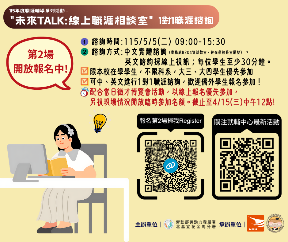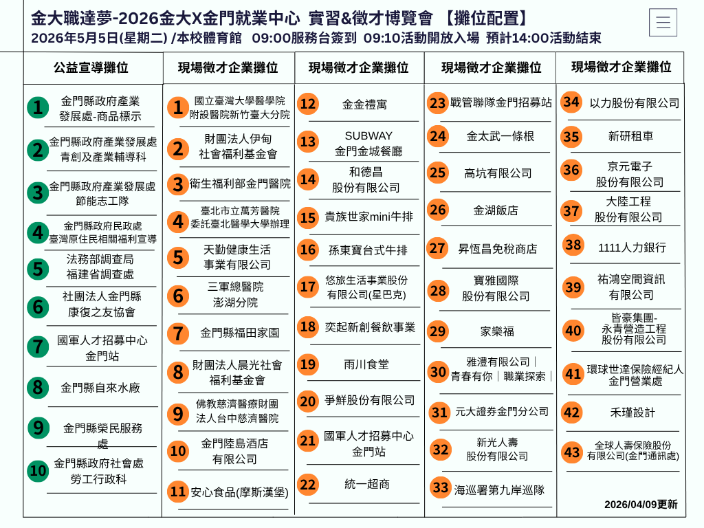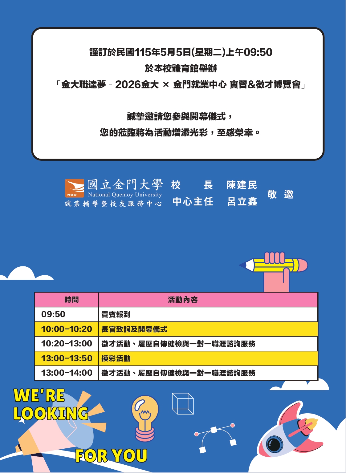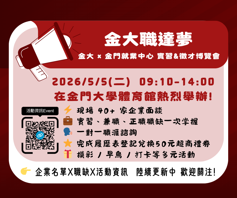 📢⭐【徵才博覽會專區】5月5日金大職達夢–2026金大 × 金門就業中心 實習&徵才博覽會,參加徵才企業、職缺資訊、職涯諮詢、實習&徵才說明會通通在這裡!持續更新,敬請關注!