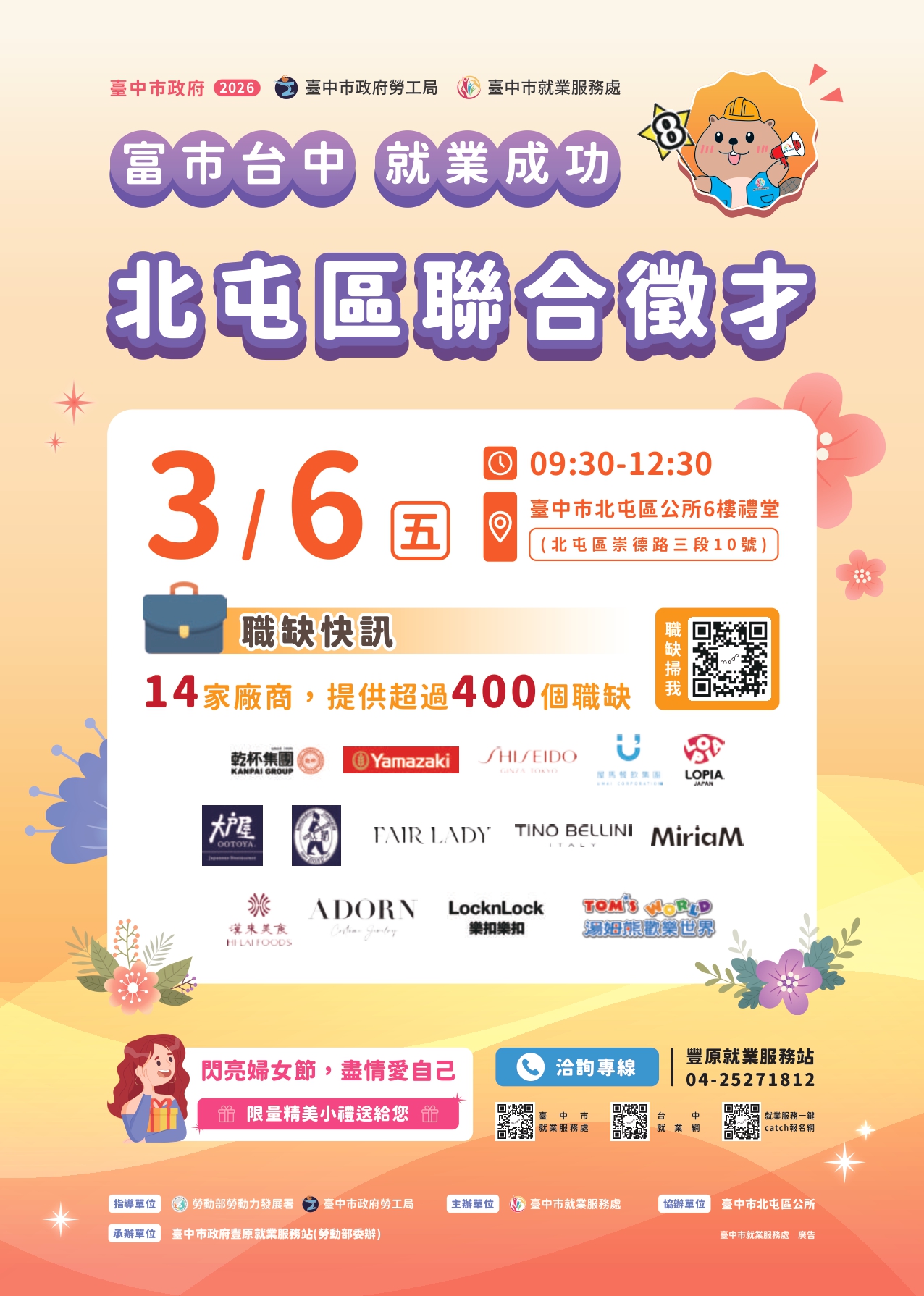 【臺中市政府勞工局】本市就業服務處訂於115年3月6日(星期五)假北屯區公所6樓禮堂辦理「富市台中 就業成功」北屯區聯合徵才