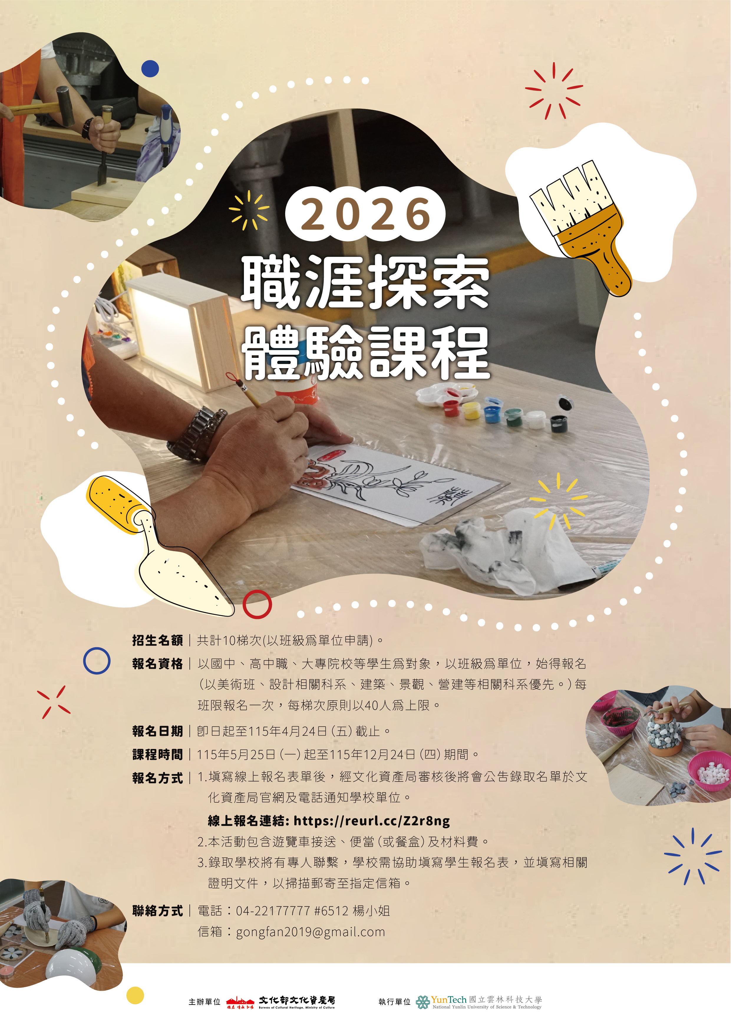 【教育部】 函轉文化部文化資產局(下稱該局)辦理文資傳匠工坊「2026職涯探索體驗課程」,歡迎有興趣的同學踴躍報名參加!(報名開始日起至115年4月24日截止)
