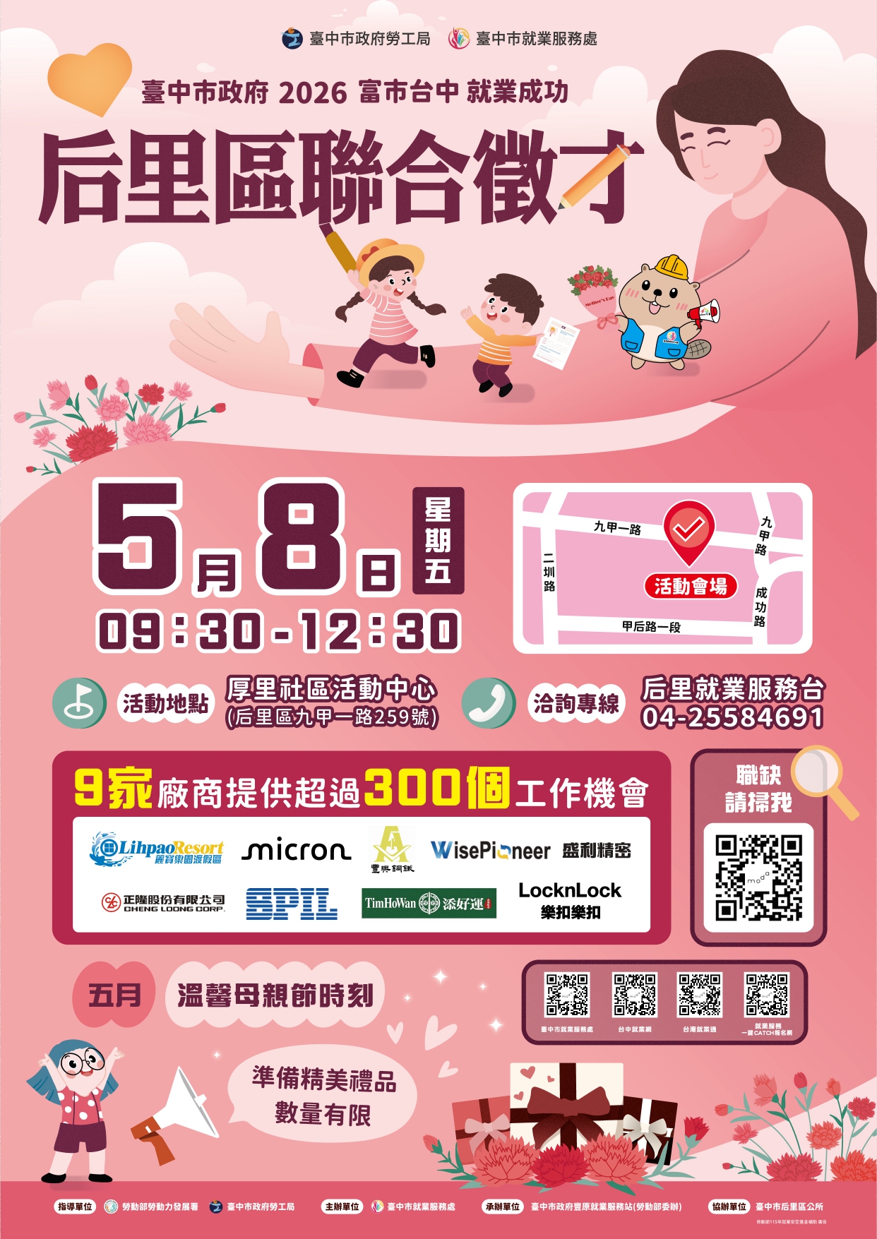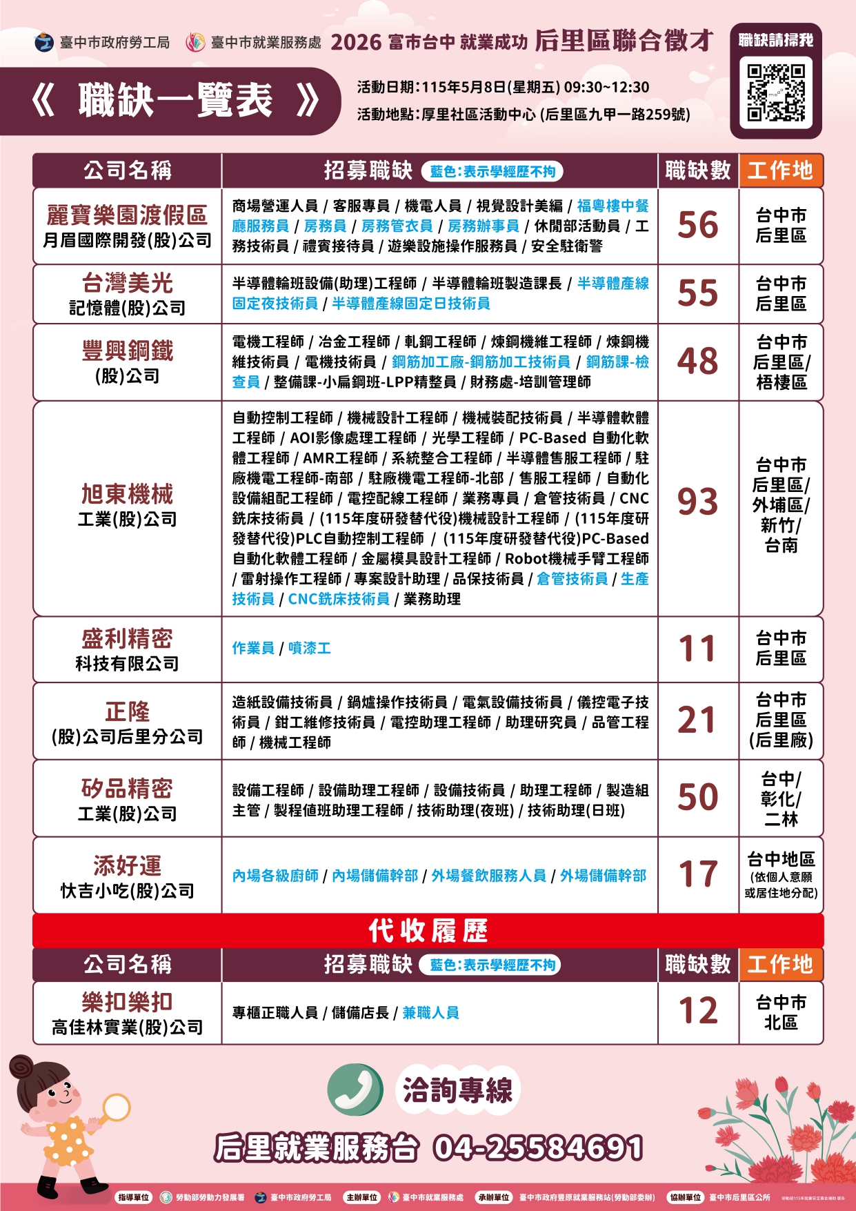 【臺中市政府勞工局】本市就業服務處訂於115年5月8日(星期五)假厚里社區活動中心辦理2026「富市台中 就業成功」后里區聯合徵才,敬請惠予協助宣傳周知踴躍參加,至紉公誼,請查照。